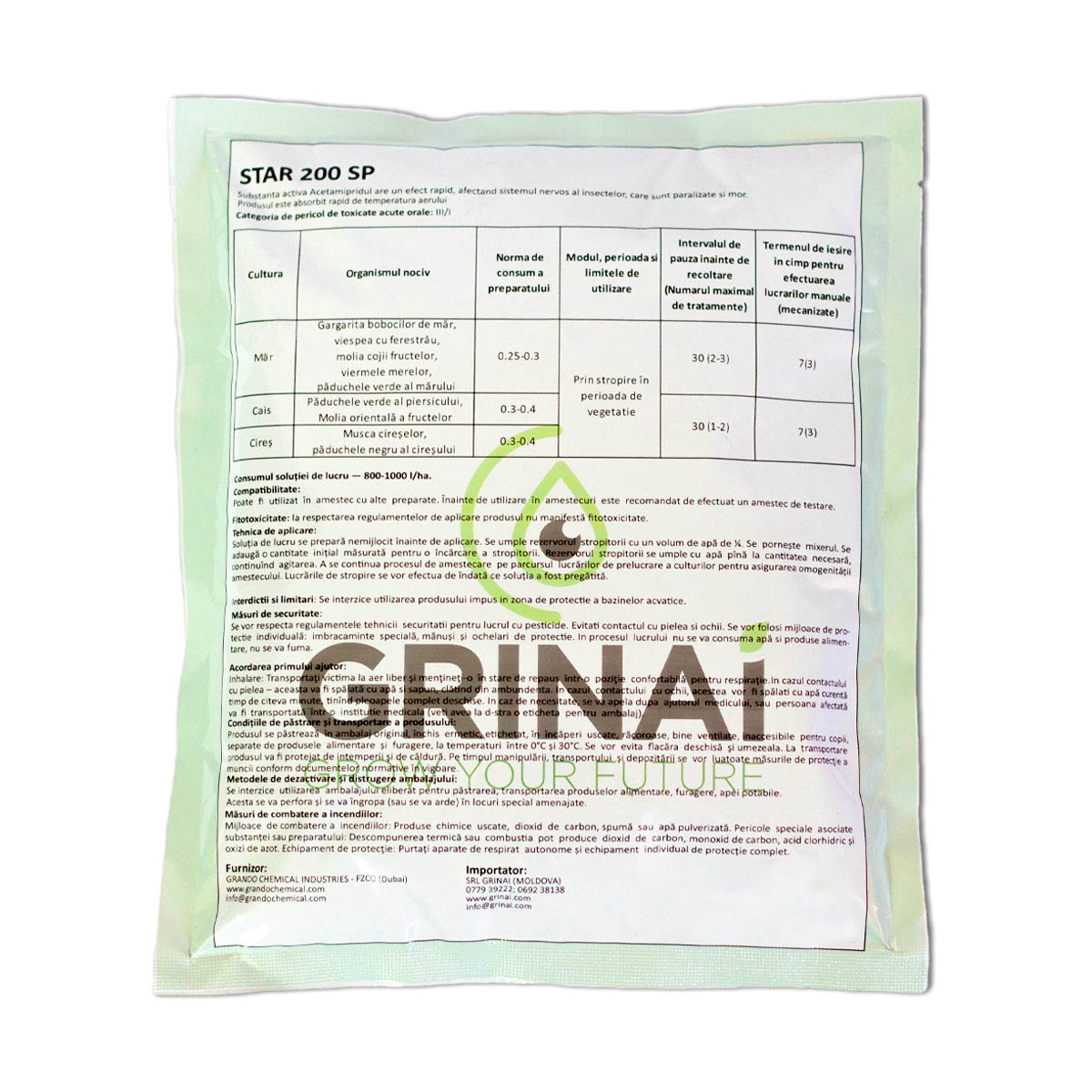 STAR 200 SP — системный инсектицид контактно-кишечного действия против представителей отрядов равнокрылых, жесткокрылых, полужесткокрылых и чешуекрылых. Характеризуется хорошим системным и трансламинарным действием по отношению к растениям: поглощается всеми частями растения и равномерно распределяется по нему. Благодаря этому эффект от препарата проявляется даже на необработанных частях растения: вредители гибнут в результате как от непосредственного контакта с препаратом, не только обработанных но и необработанных частей растения.